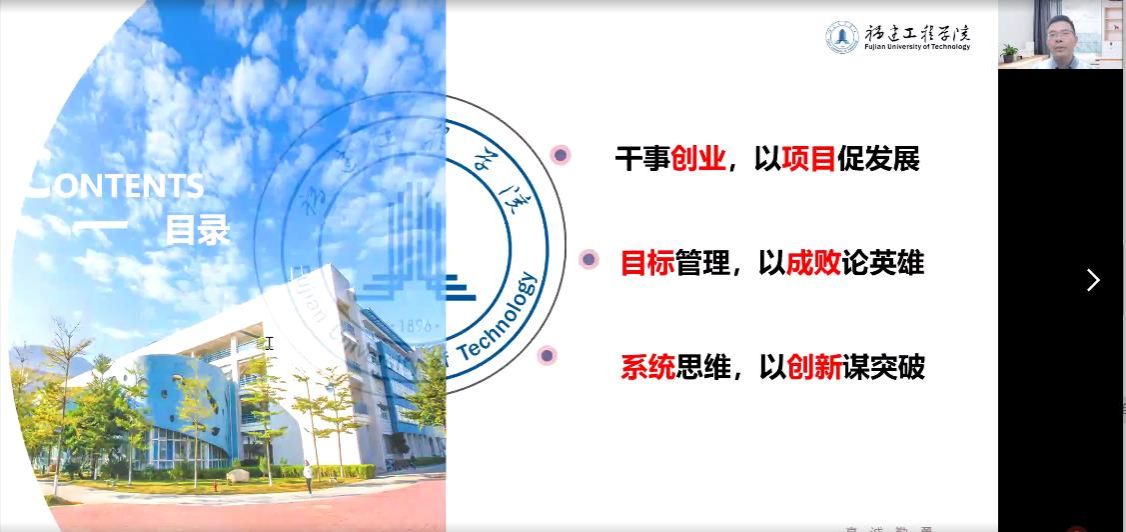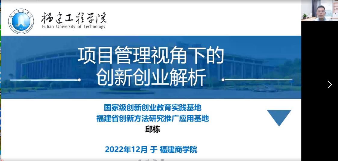 2022年12月6日,米兰官网工商管理系邀请福建工程学院邱栋副教授在线上开展了题为“项目管理视角下创新创业解析”的专题讲座。邱栋副教授为福建工程学院管理学院副院长、硕士生导师,福建省创新方法研究推广应用基地负责人、国家级创新创业教育实践基地骨干、国家级一流本科课程《创新思维与知识创业》骨干、中国技术经济学会复杂科学管理分会理事、国家技术创新方法与实施工具工程技术研究中心创新方法培训师。讲座由工商管理专业负责人陈颖老师主持,工商管理系150余人在线参加了本次讲座。