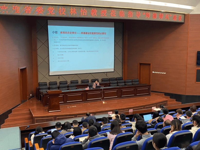 林怡教授从师德建设的重要性和必要性,中国共产党的文化教育观与师德建设,优秀传统文化对师德建设的涵养,社会主义核心价值观与新时代师德建设的内涵,春风化雨与立德树人等五个方面阐述了师德师风建设。在讲座中,她结合自身经历,用温暖、质朴、生动的语言,阐释了一名高校老师的责任与担当。她强调,作为高校教师,一是要坚持教育者先受教育,努力成为新进思想文化的传播者、党执政的坚定支持者,更好担起学生健康成长指导者和引路人的责任;二是要加强师德师风建设,坚持教书和育人相统一,坚持言传和身教相统一,坚持潜心问道和关注社会相统一,坚持学术自由和学术规范相统一;三是教师要树立职业的自豪感、责任感和使命感,要以德立身、以德立学、以德施教。