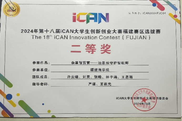 10月19日,由iCAN大学生创新创业大赛组委会、山东大学主办,厦门大学、福州大学至诚学院、福建省产教融合促进会承办的第十八届ICAN大学生创新创业大赛福建赛区选拔赛,在福州大学至诚学院成功落下帷幕,ac米兰官方网站副院长严谨教授、王棋元副书记作为指导老师,对参赛学生进行耐心、细致地指导,在机器人专家杨建华副研究员团队和福建沈郎乡、湖南大三湘、江西茶椿江的品牌支持下,米兰官网许云曦、刘灵等同学经过激烈的角逐,取得了福建赛区二等奖的好成绩。