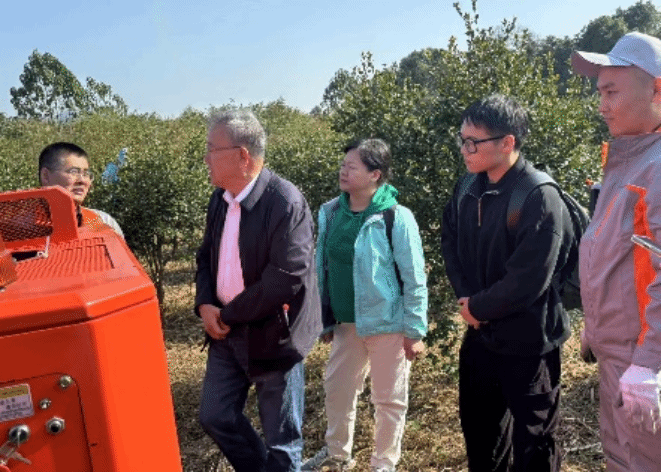 哈尔滨林业机械研究所举办的油茶机械化采收效受中国林科院亚林中心的邀请,24日下午,科技服务团前往宜春分宜,了解全国油茶采收机械研发创新团队的建设成果,以及未来在上栗县的推广和应用事宜,并观摩了25日上午由国家林业和草原局率对比实验。严教授带领科技服务团深入实验基地的油茶林,了解油茶的种植方式和生长情况,并与上栗县油茶林的产量和采摘方式进行比较。