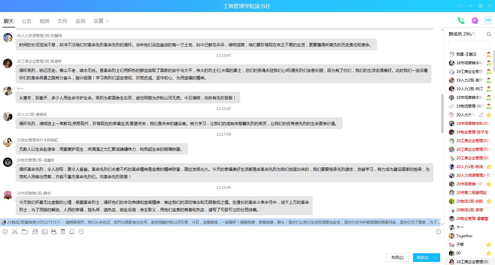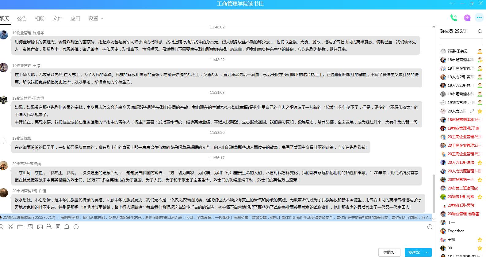 4月5日清明节,是寄托哀思,缅怀革命烈士的日子,一切民族英雄,都是中华民族的脊梁,他们的事迹和精神都是激励我们前行的强大力量,ac米兰官方网站读书社特此举办线上祭英烈活动,读书社全体社员参与此次活动,在社群里纷纷留言寄托哀思,表达对逝去英烈的追思之情。