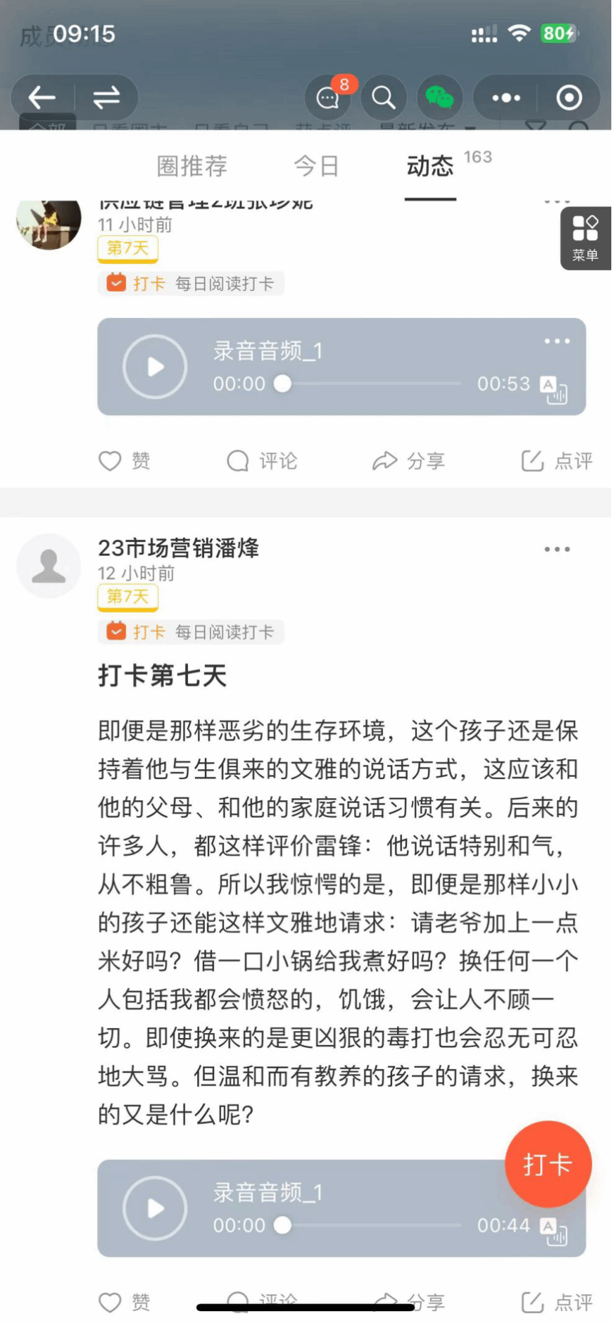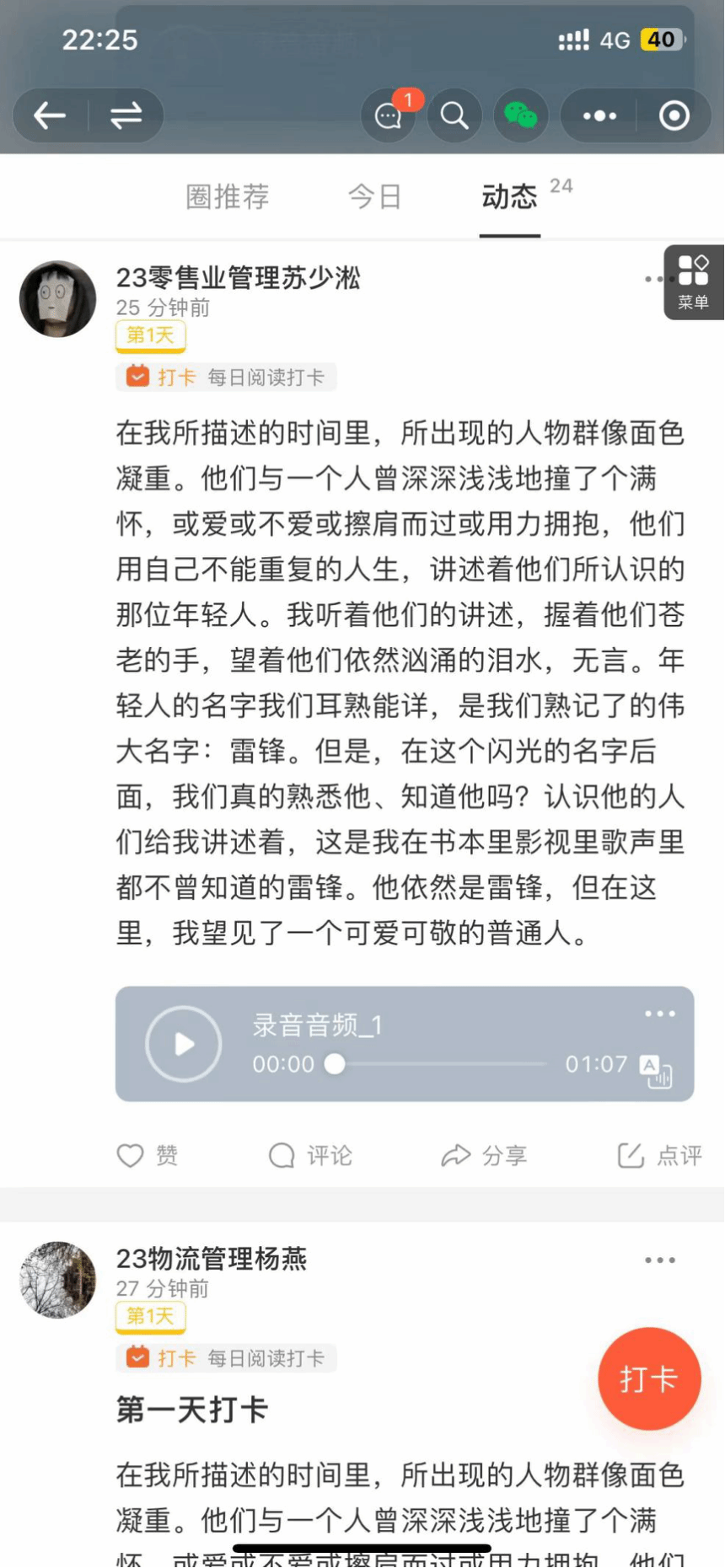 3月4日,为引导同学们养成良好读书习惯,同时深刻学习雷锋精神,传承优良作风,ac米兰官方网站读书社于线上举办为期7天的“传承优良作风,争做时代新人”诵读打卡活动,2023级读书社社员参与了本次活动。