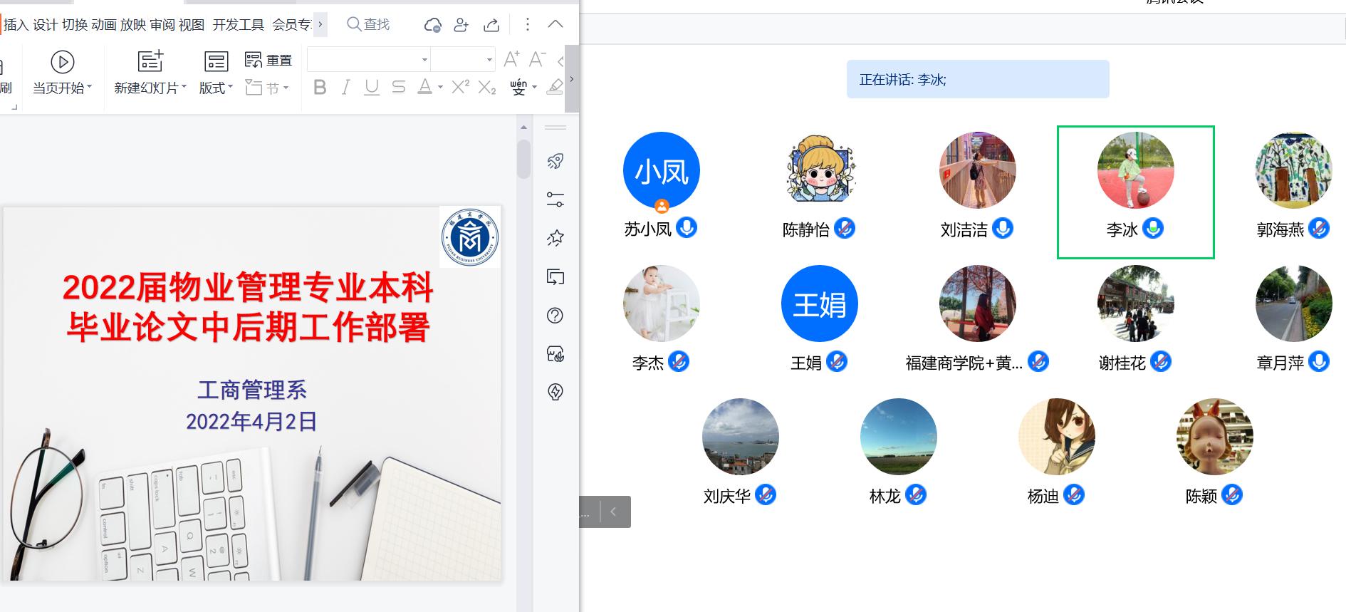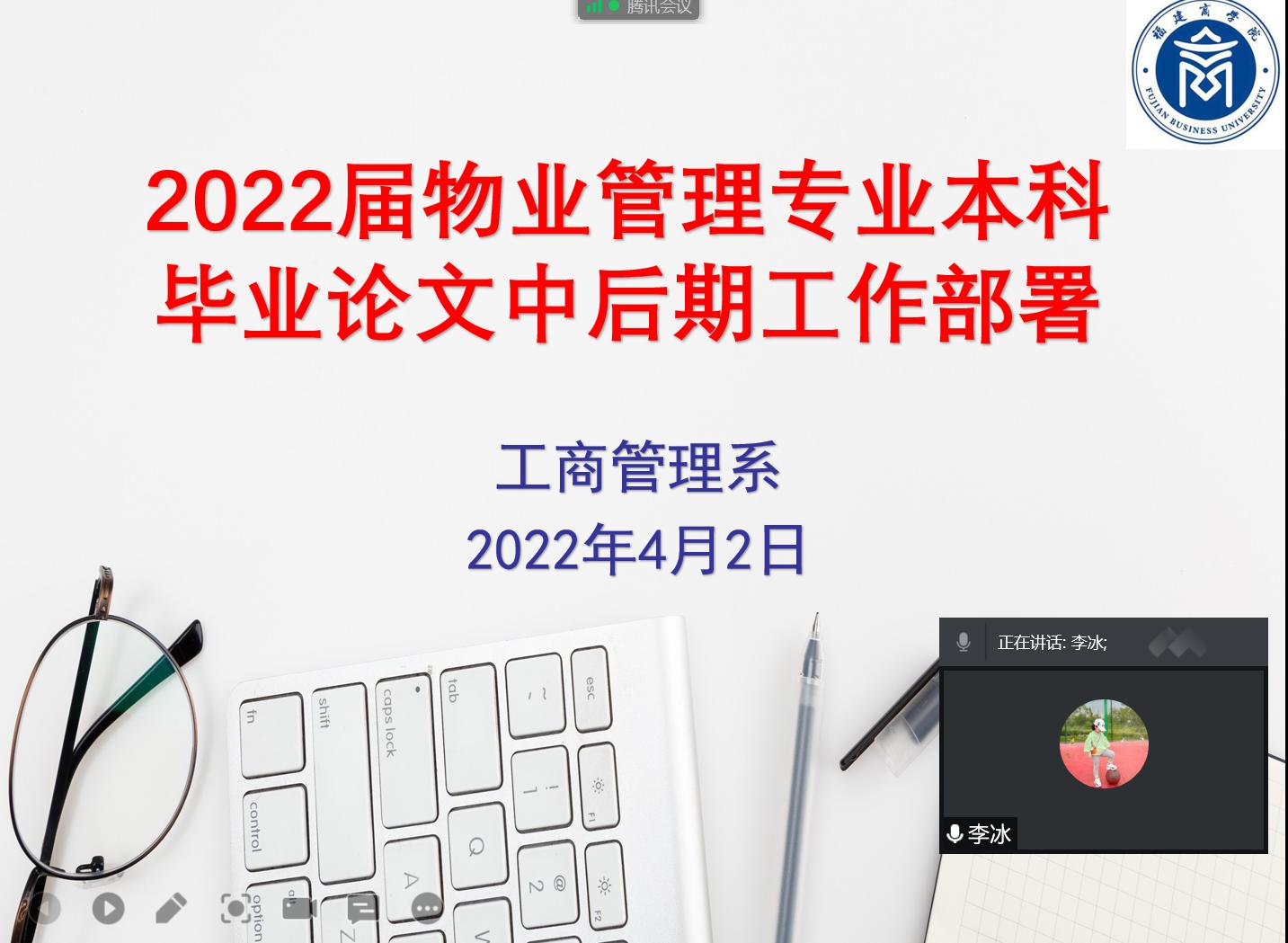 为进一步加强毕业论文各环节的管理,提高毕业论文质量,按照2022届本科毕业论文工作计划,工商管理系于2022年4月2日晚上7:30在腾讯会议召开2022届毕业论文中后期工作推进会。ac米兰官方网站院长章月萍教授莅会指导,工商管理系系主任杨迪副教授、副主任谢桂花副教授、专业负责人李冰副教授及全体指导教师和物业管理专业毕业生参加会议。会议由苏小凤副教授主持。