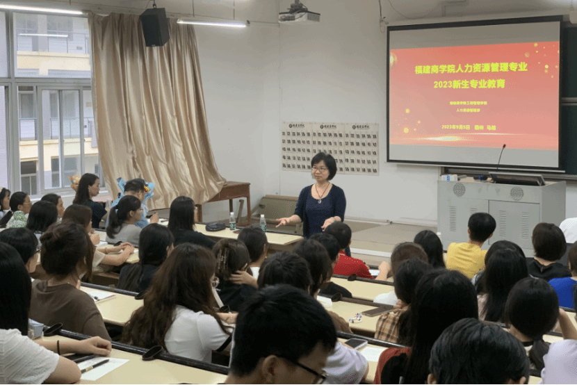 人力资源管理系主任陈柏良简要介绍了人力资源管理本科专业人才培养情况和福商HR师资团队概况,通过具象化的福商HR专业公共品牌LOGO带领2023级人力资源管理专业新生尽情想象福商HR专业与职业的美好未来,呼吁协同共创、共建、共享福商HR专业品牌,聚力打造福商HR专业人才成长摇篮。