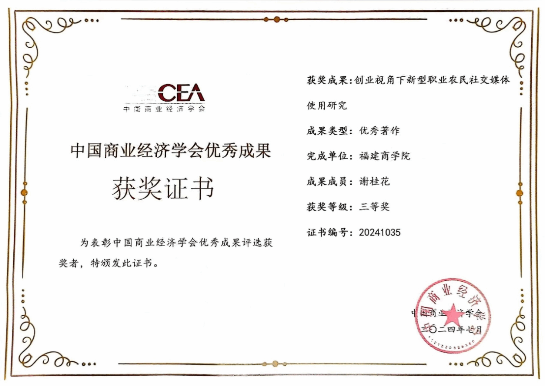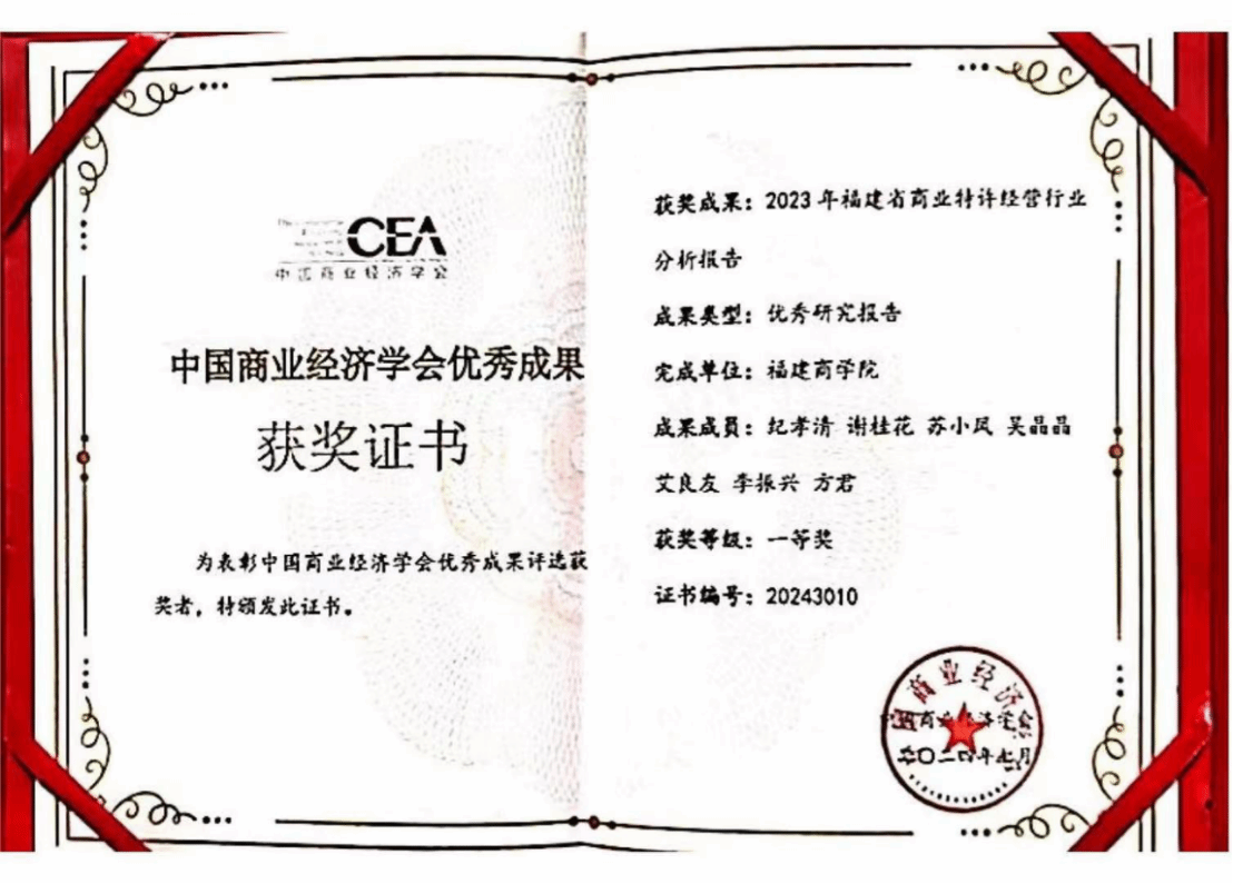 近日,第三届中国商业经济学会优秀成果评选结果揭晓,米兰官网两位教师光荣上榜,其中,纪孝清副教授主持的《2023年福建省商业特许经营行业分析报告》获优秀成果(研究报告)一等奖,谢桂花副教授的专著《创业视角下新型职业农民社交媒体使用研究》获优秀成果(著作)三等奖。