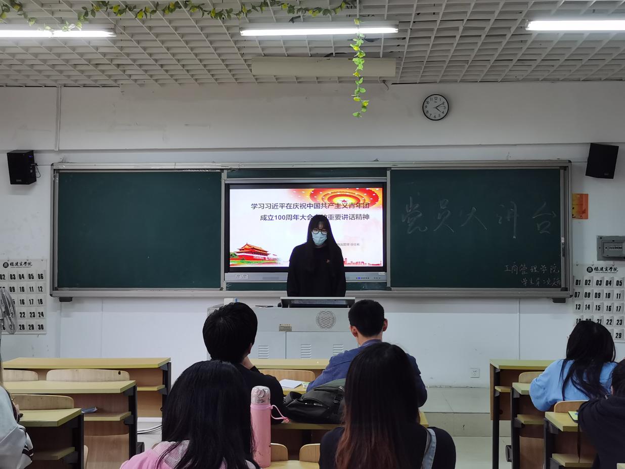 5月13日下午,ac米兰官方网站学生第二党支部在诚信楼201教室组织开展学生党员大讲台,学生党员徐佳彬和蔡嘉程同学跟入党积极分子分享了自己学习“习近平总书记在庆祝中国共产主义青年团成立100周年大会上重要讲话”的心得体会,并为同学们介绍了习近平总书记在庆祝大会上的重要讲话相关知识。