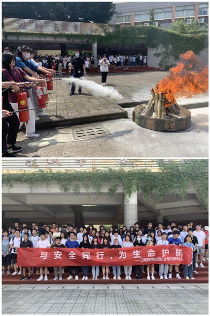 随后模拟教学楼起火,发生火灾后学生应该如何自救逃生,消防器材如何使用和如何扑灭初起火灾。演练现场,在烟雾弹模拟的火灾情景下,学生用湿毛巾或手捂住嘴巴,弯腰,迅速有序地跑出,并有序从走廊两侧离开,到达应急集合点。在空旷的集合点处,模拟火灾现场,让同学们亲自操作使用灭火器,扑灭明火。