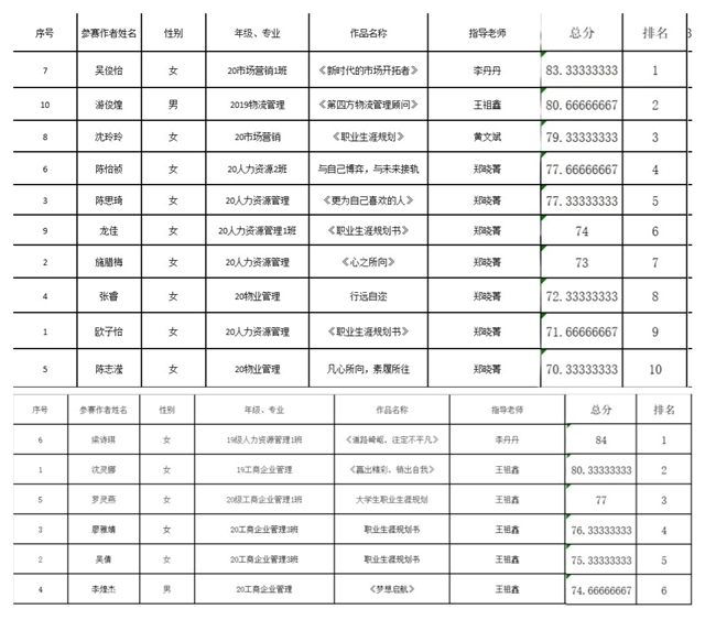 学院积极动员、组织学生参赛,在各位指导老师的辛勤指导下,参赛同学严肃认真地根据自己的实际情况,进行科学合理的职业生涯规划。为突出职业生涯规划书撰写的重要性,也为营造更加公平、公正的比赛环境,今年学院此项比赛采取匿名方式,上交规划书给评委老师评阅。 本次学院邀请了ac米兰官方网站党委副书记黄珏群老师、团委书记韩玉娟老师、学生第二党支部书记王鹤云老师、辅导员李倩颖老师担任评委。经评审,最终从专科组和本科组中各选出两名选手入选校赛,他们分别是本科组吴俊怡、游俊煌以及专科组梁诗琪、沈灵娜。