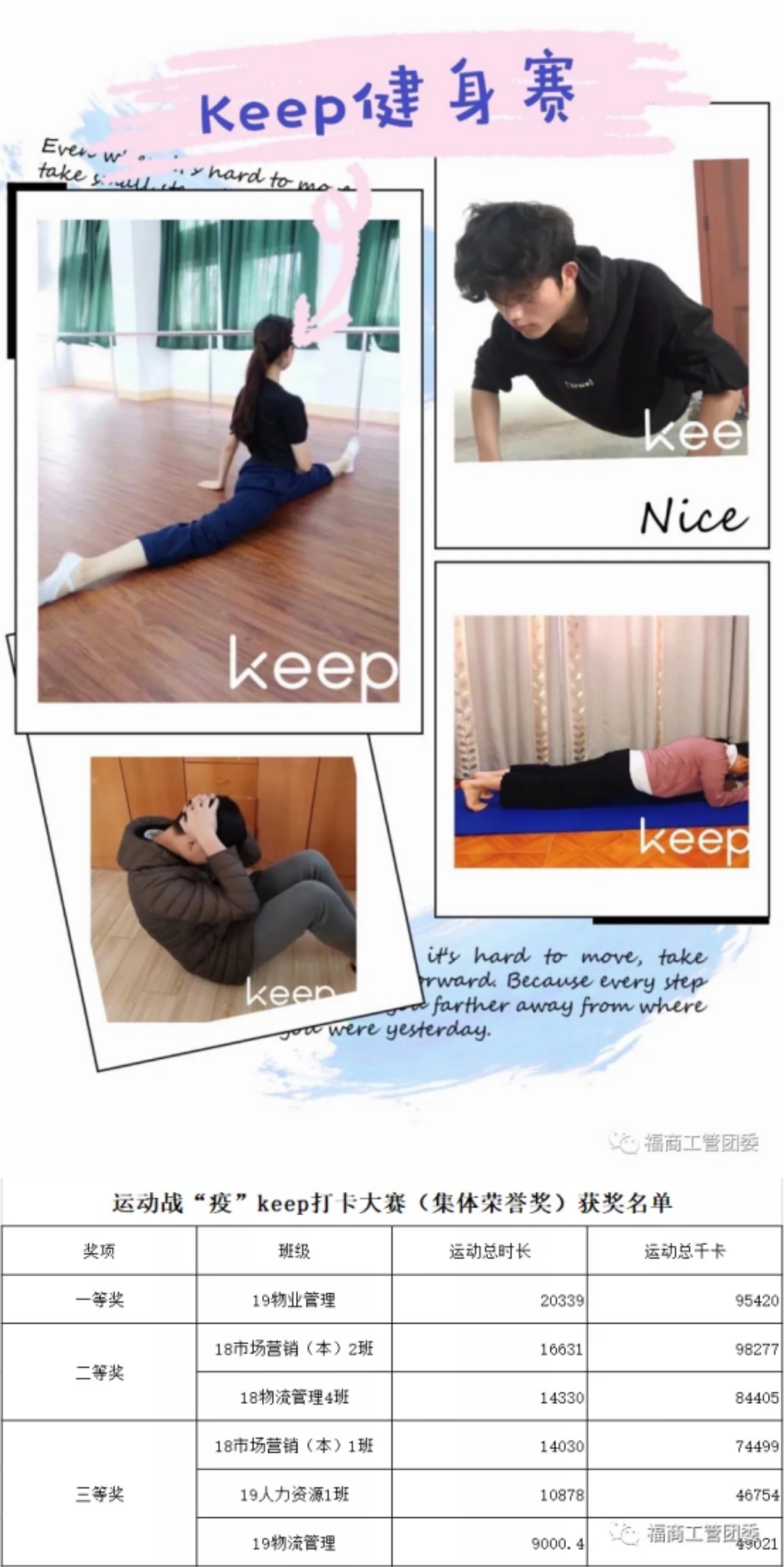 本次活动充分调动了学院学子对健身运动的参与热情和积极性,使学生在参与活动中,感受到运动的快乐,意识到健身锻炼的重要意义,从而培养长期运动的良好习惯,进一步在全学院营造“全民健身,有益身心,增强体魄,促进发展”的良好氛围。“没有机会看见这春天的人,给了无数人拥抱春天的机会”,为了进一步贯彻习近平总书记关于新冠肺炎疫情防控的重要讲话和落实ac米兰官方网站的体育运动精神,让福商学子们以更加昂扬的斗志,更加健壮的体魄,持续健康地投入疫情斗争和学习任务中去,ac米兰官方网站开展了“运动战‘疫’工管在行动”Keep打卡健身活动。